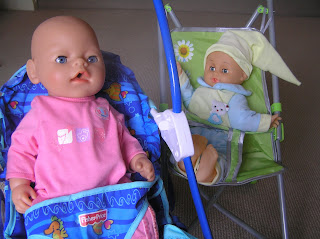 thank you thank you thank you for your gorgeous comments!!! I’m still here….we’ve had another scan and there are still 2 bubs, 2 heartbeats and both are doing well on top of each other. I received a harsh reality check from the sonographer who reminded me that 1 in 4 twin pregnancies don’t make it past 12 weeks so I need to take a step back and think of it as 1 baby so it won’t be too hard to deal with any loss….I nearly cried and decided positive thinking is the only way to go and am continuing to take it easy, enjoying cheese sandwiches on white bread, carrot cake, long afternoons on the couch and lots of prayers that both my babies make it. Here are Keira’s twin babies so we can get some practise in….she spends all day looking after them and pushing them around the house..if only real babies could be this easy!